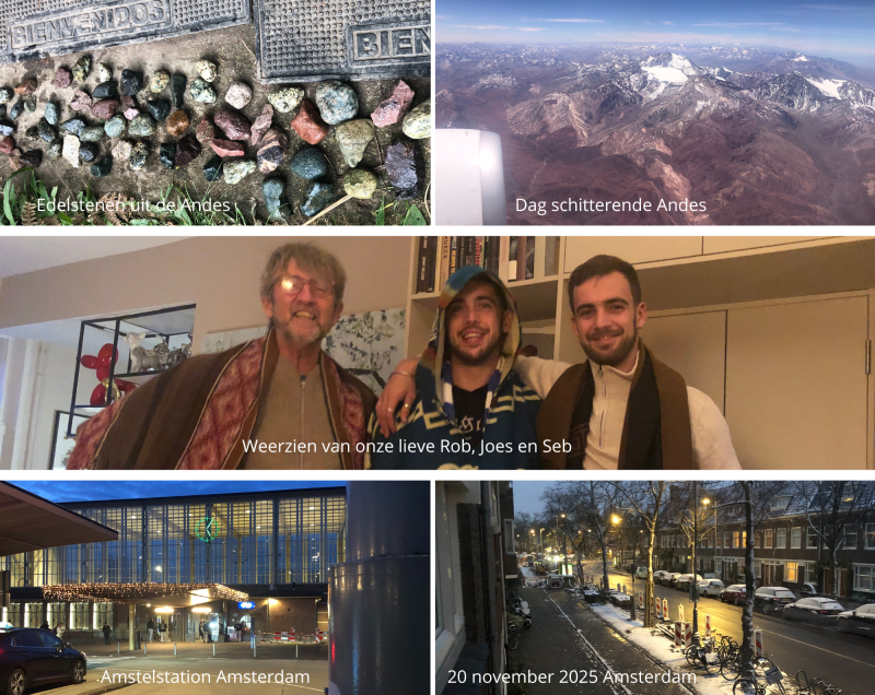 Op 19 november vertrekken we vanuit Santiago, Chili. Arno brengt ons naar de luchthaven en samen wachten we even in de enorme rij die niet opschiet. Het is lekker weer 30°C. Eenmaal in de lucht vliegen we over de Andes. Wat hebben we een goede herinneringen aan dit gebergte. Iedereen bezingt het, beklimt het, wandelt erin, doet er rituelen in en nu begrijpen we waarom. De Andes is de reden geweest waarom we in zuid Amerika wilden reizen. In onze rugzakken zitten stenen uit het gebergte als aandenken. Ze zien eruit als edelstenen en zo behandelen we ze ook, met respect en heiligheid.