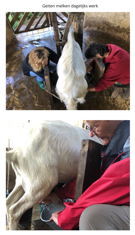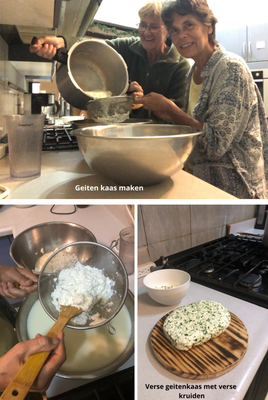 De geiten stal wordt eerst schoon geveegd van alle keutels. Geit Margaret wordt altijd als eerste gemolken. Omdat ze nog een baby heeft geeft ze het minste melk. En ze houdt niet zo van gemolken worden, dus worden haar poten vastgebonden. Daarna melken we Fanny, die een stuk rustiger is en veel melk geeft. Van de verse geitenmelk maken we minstens 1 keer per week geiten kaas met of zonder verse kruiden. De kaas met kruiden smaakt heerlijk. De kruiden plukken we uit de green house of de kas vlakbij het huis.