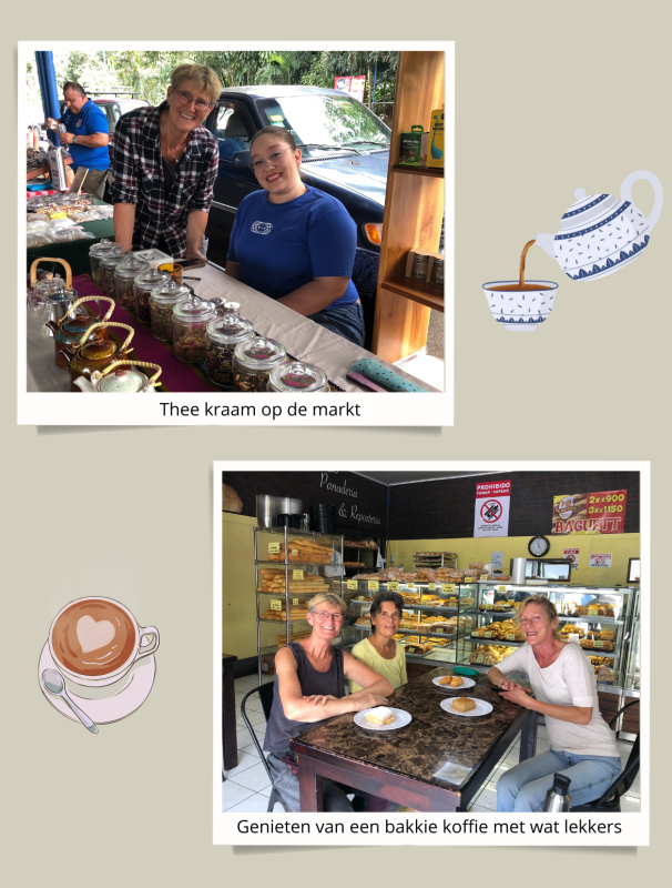 Iedere vrijdag hebben we een uitje naar het stadje Grecia om naar de markt te gaan. Vaak lunchen we met de vier vrijwilligers. Daarnaast is er een kleine bibliotheek waar we Spaanse kinderboeken hebben geleend om onze taal te leren. We houden onze Spaanse lessen dagelijks bij. Het blijft een uitdaging om Spaans terug te praten, al gaat het steeds beter. Veel Costaricanen spreken geen engels een goede oefening dus.