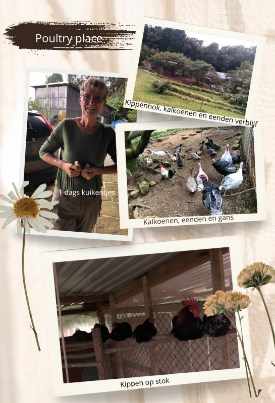 Deze week hebben we het staaldraden dak van het kippenhok gerepareerd. Er zijn zo’n 12 kippen. Zij zitten in een apart hok dat helemaal omringd is met gaas, ter bescherming tegen roofdieren. Naast de kippen lopen de 10 kalkoenen in een grote open ruimte. De kalkoenen slapen in de boom, samen met een eenzame haan. Deze week zijn er kuikentjes geboren. Omdat ze zo kwetsbaar zijn werden ze apart gezet in een ruimte met rood warm licht om ze warm te houden en te beveiligen. Lida loopt met twee piepende kuikentjes op haar buik naar hun nieuwe onderkomen. Moeder kalkoen zoekt haar kuikentjes op maar wordt in de boom gezet en leeft haar leven samen met de andere kalkoenen. Ze heeft 6 weken op haar eieren gezeten.