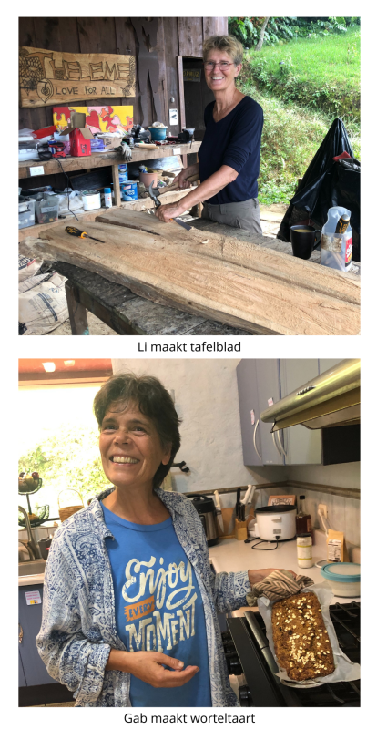 The work never stops. In the greenhouse, we keep the plants green. Giving plants space, planting new plants and seeds, working the soil, etc. Lida is the handywoman on the grounds. She protects the drainage system from fallen leaves. She makes and planes a beautiful smooth wooden tabletop from a tree in the forest.